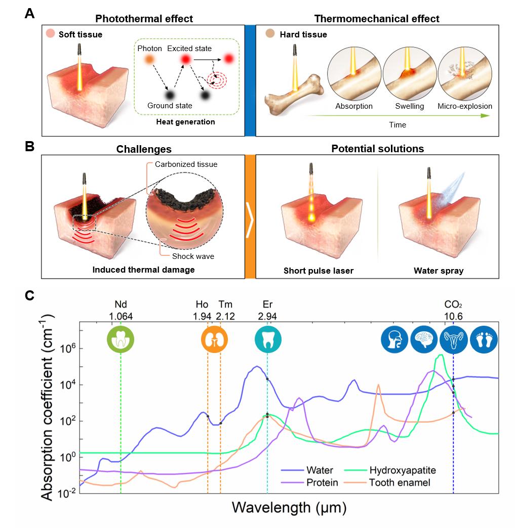 與基于機械加工的傳統(tǒng)手術(shù)工具不同,激光手術(shù)刀通過獨特的組織光學(xué)作用實現(xiàn)高效生物組織加工。文章詳細(xì)闡述了針對軟組織與硬組織切除的光熱消融與光致機械消融機理,并討論了水介導(dǎo)和超短脈沖激光技術(shù)在緩解組織凝結(jié)、碳化等熱損傷方面的研究進展(圖1)。進一步地,文章分析了以Nd、Ho、Tm、Er和CO2激光為主的紅外醫(yī)療光源在牙科、泌尿外科等多種手術(shù)領(lǐng)域的特點、優(yōu)勢與應(yīng)用價值,并強調(diào)新型手術(shù)激光光源技術(shù)的進步給激光傳輸介質(zhì)在靈活性、穩(wěn)定性和操控性等方面帶來的巨大挑戰(zhàn)。