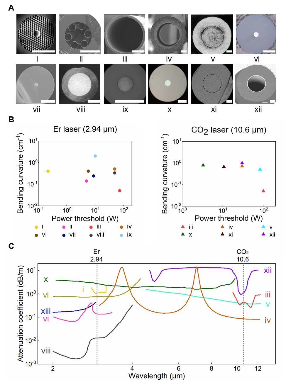 激光傳輸介質(zhì)作為激光手術(shù)刀系統(tǒng)中的關(guān)鍵器件,需要穩(wěn)定地將激光能量遞送至特定手術(shù)部位。文章系統(tǒng)闡述了導(dǎo)光臂、空心波導(dǎo)和紅外光纖三類主要醫(yī)用激光傳輸介質(zhì)的研究現(xiàn)狀,并強調(diào)小尺度、高靈活性的紅外光纖器件在微創(chuàng)外科醫(yī)療中的應(yīng)用潛力。文章全面分析了紅外光纖器件的研究進展,從激光傳輸閾值、光學(xué)損耗和機械柔性角度比較了光纖在Er激光和CO2激光中的器件性能(圖2),并指出高光學(xué)損耗和低機械強度是限制紅外光纖器件在外科手術(shù)中深度應(yīng)用的關(guān)鍵因素。近年來多材料纖維技術(shù)的快速發(fā)展,不同光、力、電、磁等物理性能的復(fù)合材料高度一體化集成,為開發(fā)高柔性低損耗中紅外光纖并進一步提升手術(shù)器械功能性提供了可靠研究支撐。